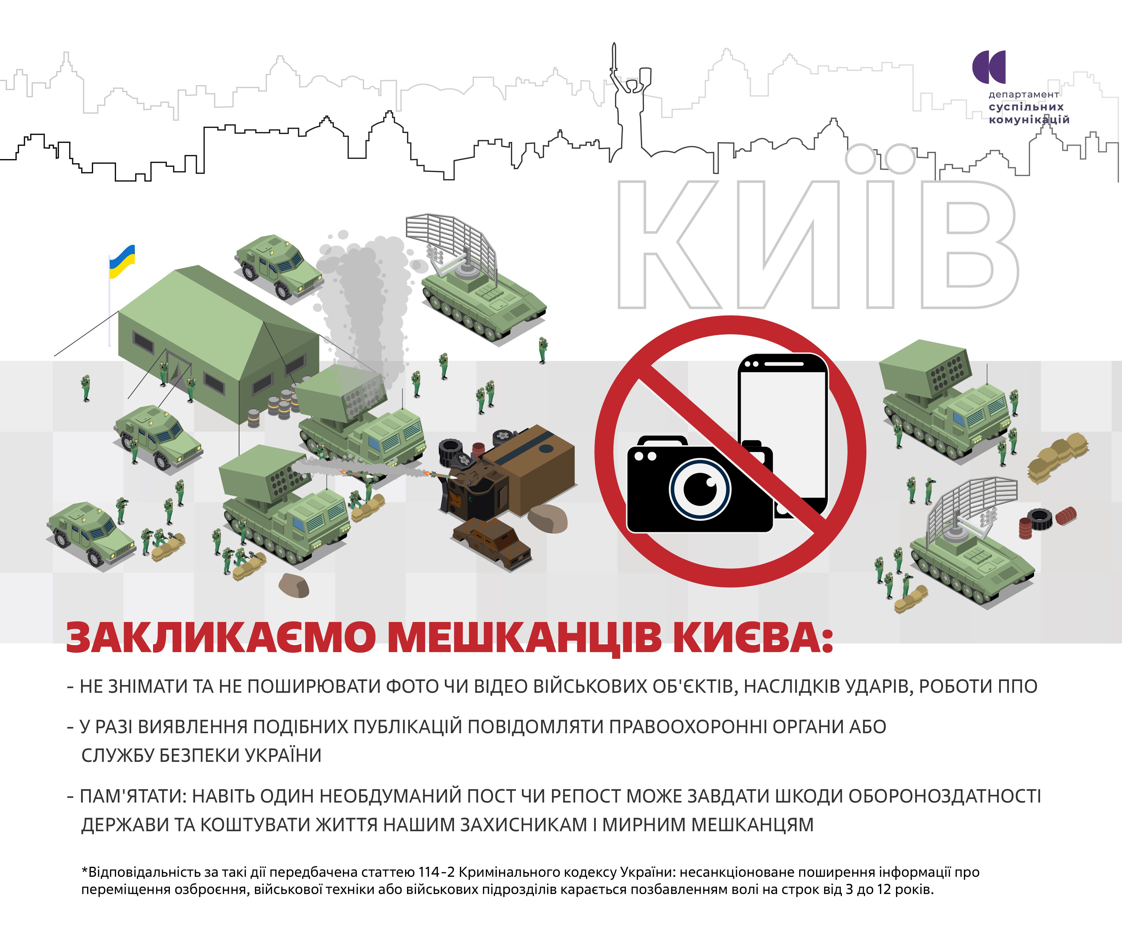 Інформаційна кампанія щодо категоричної заборони фото- та відеозйомки, а також поширення відповідних матеріалів стосовно військових об’єктів, систем протиповітряної оборони, місць уражень та будь-якого переміщення та розташування Збройних Сил України та інших військових формувань у межах міста Києва.